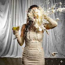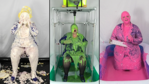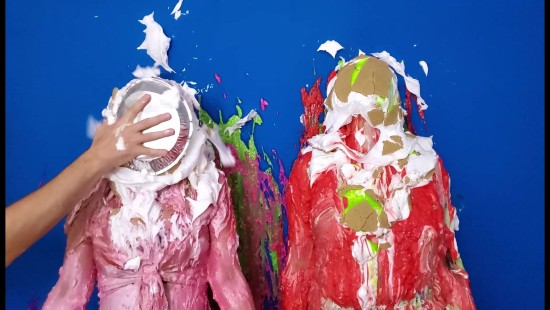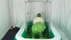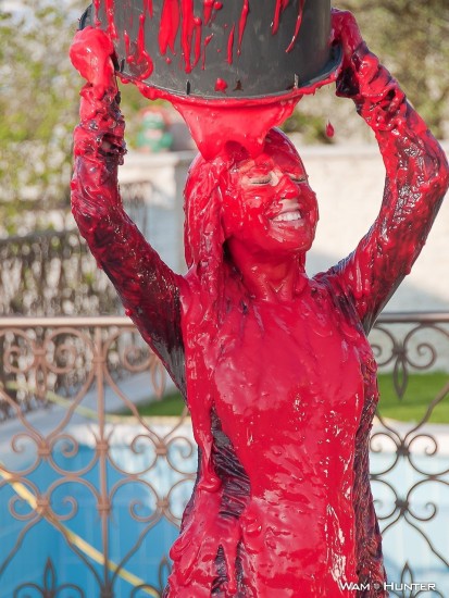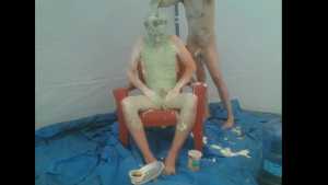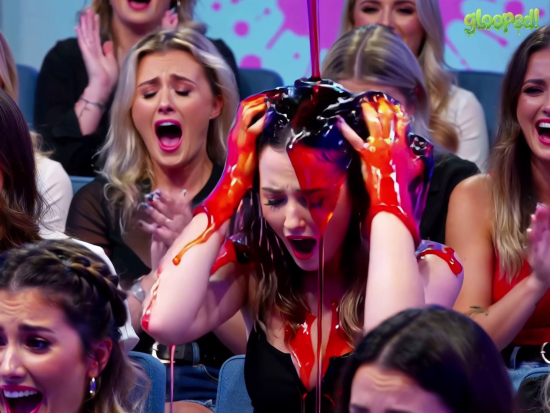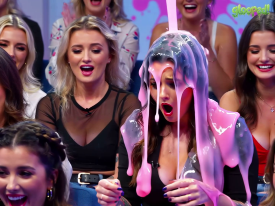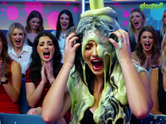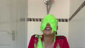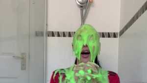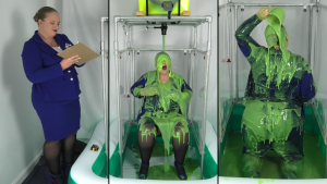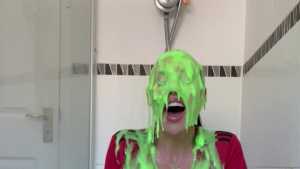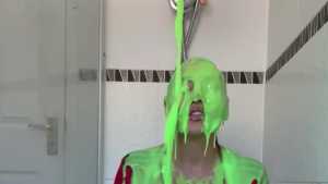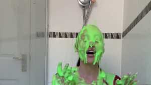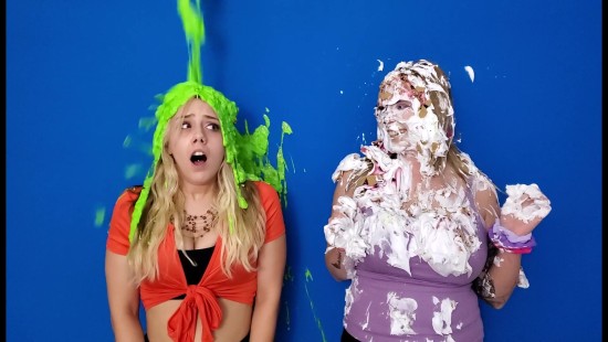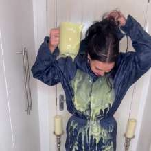 | Paola returns to The Slime and Pie Show to receive a seriously messy slop bucket followed by a huge bucket of green slime, great scene! | |