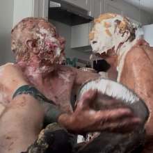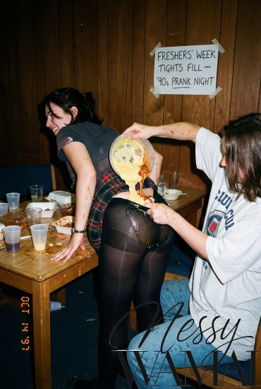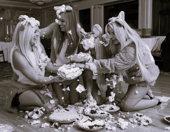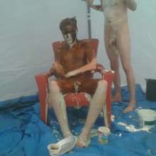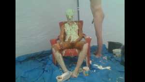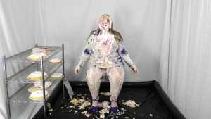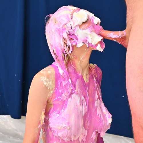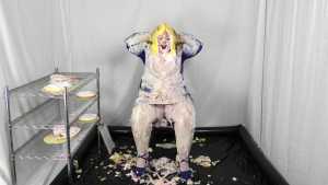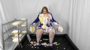 | Taking pies to the face, pie sitting and crotch pies in humiliating ways while wearing huge panties and a bra. | |