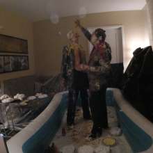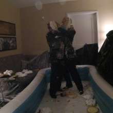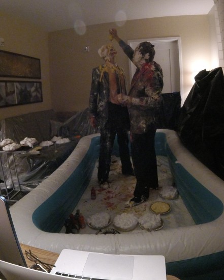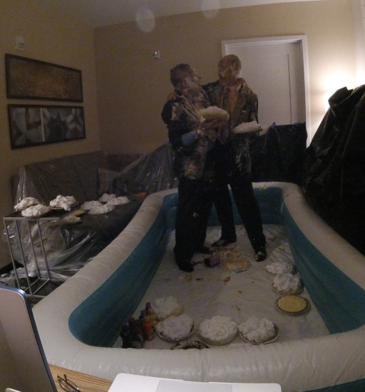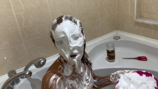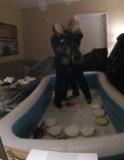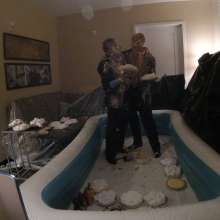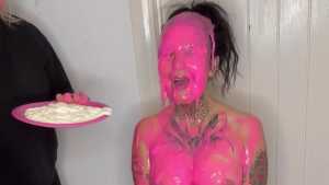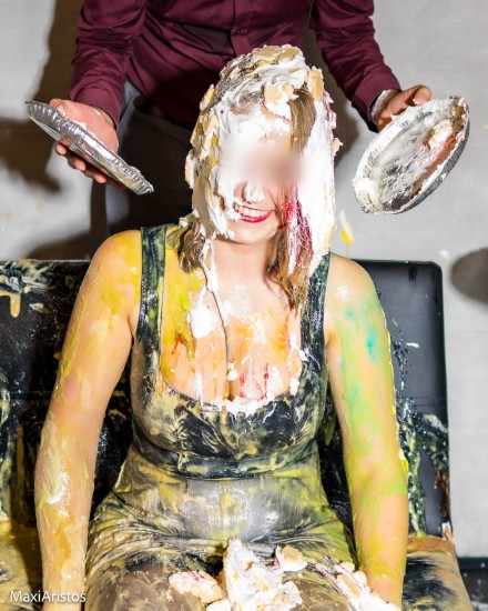 Diana gets a pie in the face! Pillow and lingerie cutting! Covered with fluff from a cut pillow! Then completely nudity!