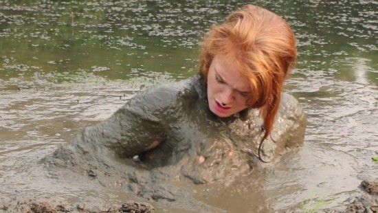 | Oxane is dressed in a thick winter down jacket, a sweater, and pantyhose. She ventures into a large, muddy area. | |