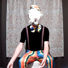 | Astrid tries her hand at clowning! while wearing a skimpy yellow clown outfit with ruffle trim, striped red thigh high leggings, and a tiny party hat... | |