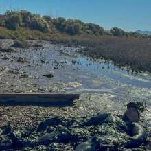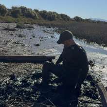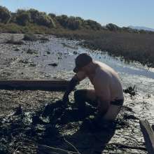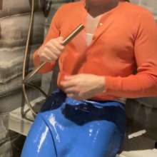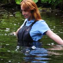 Lily Kink goes for a swim in the river while dressed in dark blue flexothane dungarees, blue wellies, and a polo shirt, and gets totally drenched!