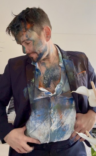 Ostin is super wet in a fantastic shower. Today he's dressed in several layers, wearing a beautiful blue sweater with a white shirt underneath, his je...