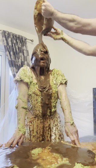 | Sabrina starts out by getting on her knees and sucking a big 8 inch cock. She then has her head dunked in a bucket of chocolate batter and is forced to continue to get her slo... report | |