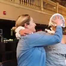 Always a good day when a former Miss Universe gets pied! Especially when she's as great a sport about it as this one was!
