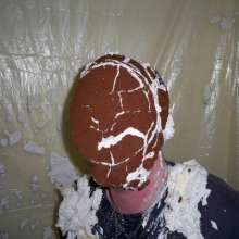 Creamed, with nose poking through. Shouldn't the shoeless pie face be seated here, treated and humiliated this way instead??
