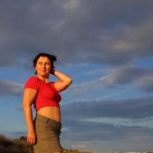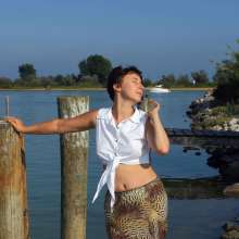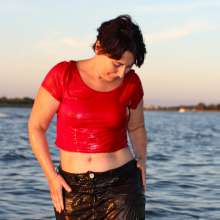 Really love the combo of the red short top, showing then nice abs, and the shine of the jeans as well, GREAT pic