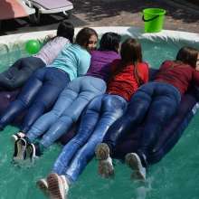 This truly is heaven I want to join this tight wet jeans party in my blu tight jeans and be on that raft underneath them with them laying on top of me