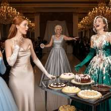 This pie fight series feels kind of unique among AI pie fight portraits, and I'm not completely sure why, but I completely adore it! There is a lot of joy here in this picture, clearly, even on the part of the pie recipient. And I must admit, I find the pie thrower here VERY attractive and find myself really wanting to see her get pied . . .