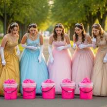Oh my! What do you propose that this perfect princess in her pretty pink dress do with a comedy-coded cream and custard confection like this? I just HATE to ponder the possibility of this pulchritudinous prima donna pelted with pies, purposefully plastered in pastry. The mind simply wobbles at the prospect of such treason against good taste and dignity . . .