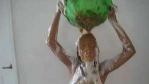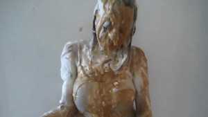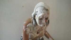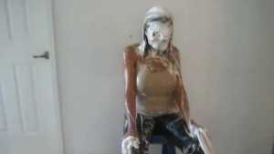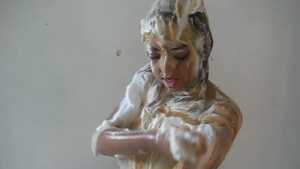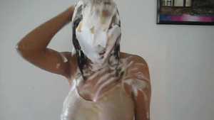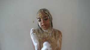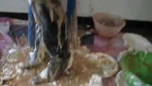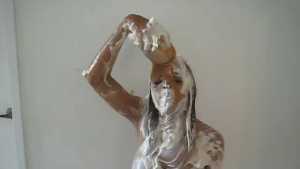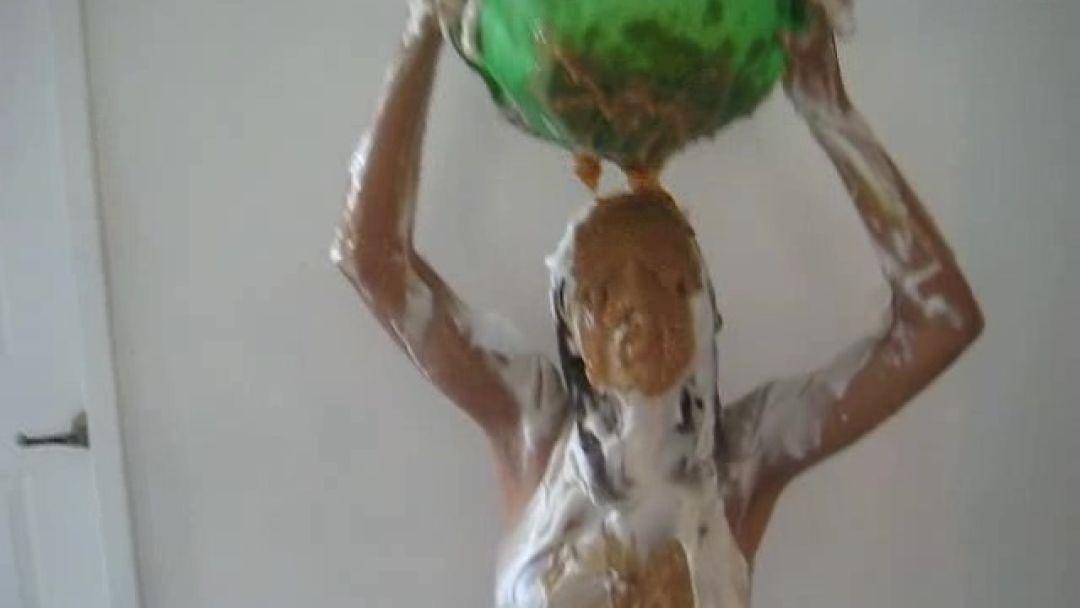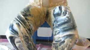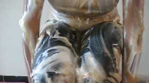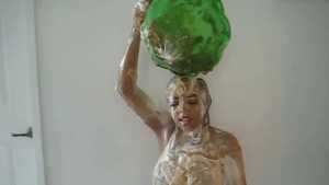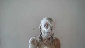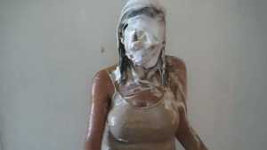 In this sequel to Ana's Mega Sliming, Ana starts messy, and continues her messy mayhem as she smashes pie after pie into her face. She then gets 2 huge bowls of chocolate slime and pours them all over her head! She covers her leather trousers in mess and then rubs all the mess over her body making sure she gets completely covered in the sticky mess!