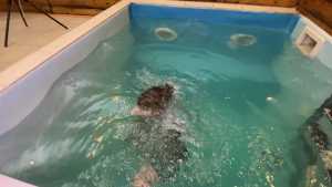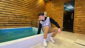 I sat on the edge of the pool and splashed, I felt my ass start to slowly get wet and I started to act immediately!  I went to the stairs that lead to the water and dangled my feet in sneakers in the pool, it was very cold water and I could not decide to go down into the water, although my desire was great!  I splashed myself with water from my hands and eventually sank under the water to get my head wet.