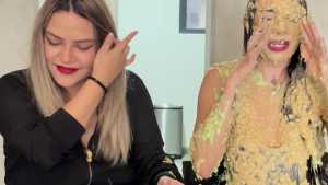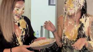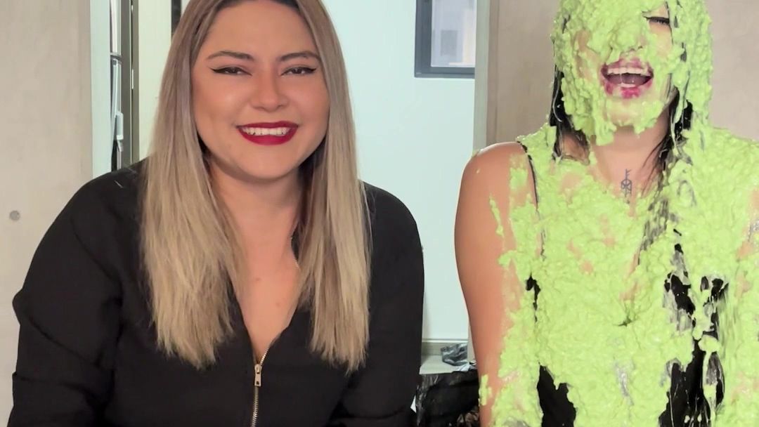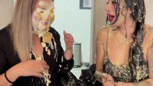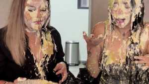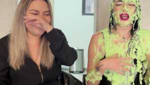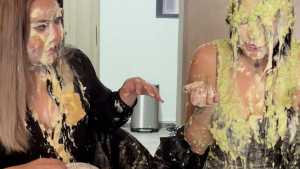 Very messy scene with Ani and Sof on The Slime and Pie Show! Sof definitely gets the worst of things here taking a big green sliming, a mixed food sliming, and multiple pies in the face while Ani receives only a single pie. Fun scene with 2 friends.