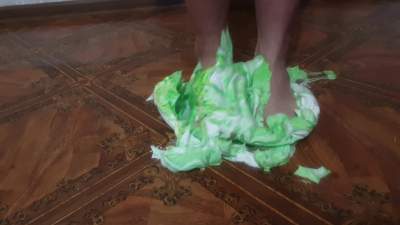 The girl receives from her friend very large pies in the face of her head. She is dressed in tight-fitting dress.