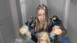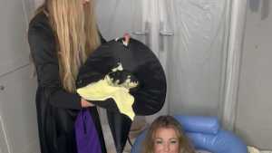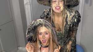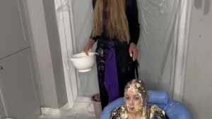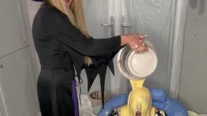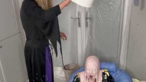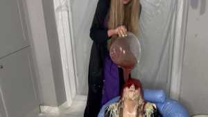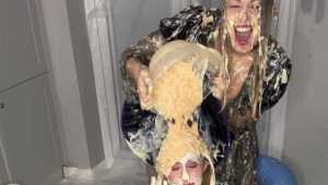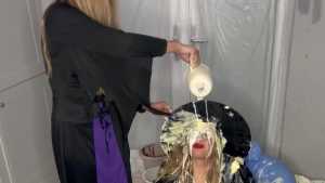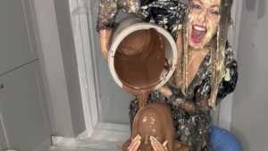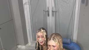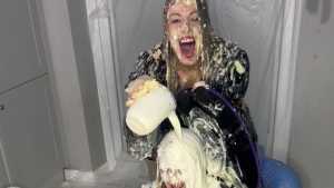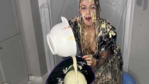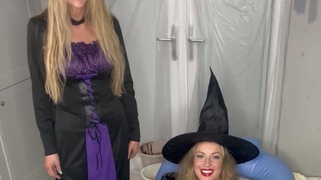 Bri and Lou are dressed as witches With Bri sitting in the inflatable bath surrounded by lots of sweet mess. Porridge, ice cream, rice pudding, chocolate cake mix, jam, lemon meringue pie, apple pie, trifles, cheesecakes, custard, yoghurt, and desert saucesLou takes it upon herself to absolutely trash Bri inside the bath filling her hat with ice cream and putting in back on bris head, pouring and pieing Bri with her sat in the tub sitting in all the slop. Bri pulls Lou in with her and returns the favour leaving these two witches completely covered from head to toe and dwelling in the slop bath and getting slop bucket to finish it with messy head dunks.