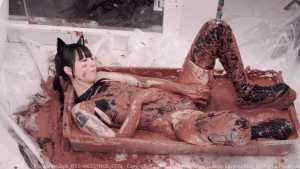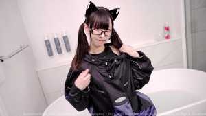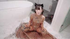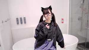 Dressed in a futuristic Y3K ensemble a designer Chloma hoodie, shiny Pharfaite swimsuit, glossy latex stockings, and sneakers Cat begins by showing off her sleek, cyber-inspired look. She then steps into a lotion bathtub, letting the thick, creamy lotion gradually coat her entire outfit until it transforms into a high-gloss, ultra-slimy sheen.