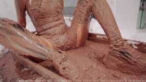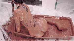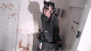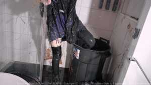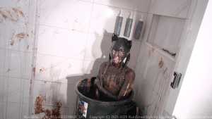 Next, Cat fearlessly submerges herself into the trash can, allowing black slime to engulf her designer pieces and push them to the brink of total destruction. After removing her hoodie, the swimsuit is revealed--and the chaos continues. Cat steps into a mud tray and smears mud over her whole body, turning her swimsuit, stockings, and sneakers into an unrecognizable, fully trashed state.