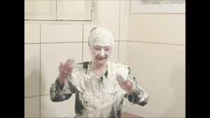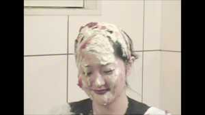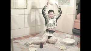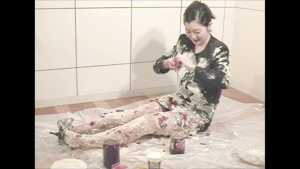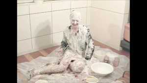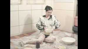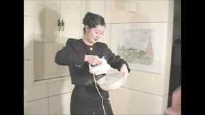 She is a cooking teacher. It seems to mix a cake today. She starts cooking with it put on a navy blue suit. It doesn't worry about her even if she is stained to the suit of cream.