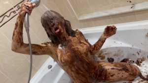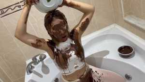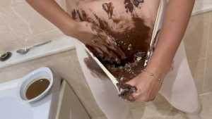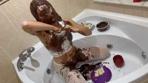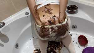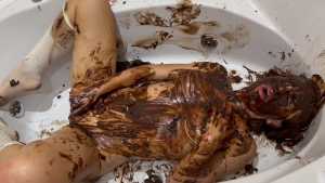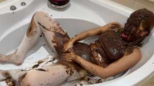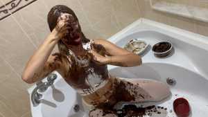 Very Hot and Very Messy!  I filled my white outfit with chocolate, pudding, and waffles!  Then I poured chocolate and pudding all over my head and got myself covered in it!  I cut up all my clothes!  And I masturbated, covered in chocolate and very aroused!  Very Hooooot!