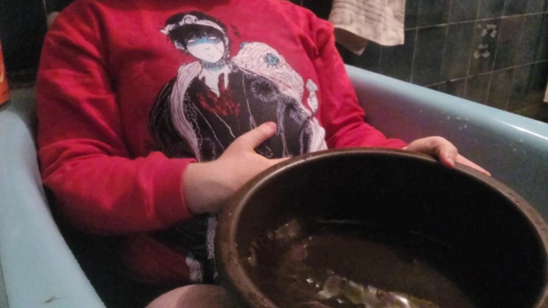 It looks like Fishboy is back at it, even after all the ripping he's gone through! And he's joined by another shirt that has been ripped a lot: Link from Ocarina of Time. Together they make a great duo, and they have no problem getting wet at the same time with a tried and tested method that's been working for years: getting gallons of water poured up on them from a bucket. So that's what happens here, I lie down in the bath and pour everything at once on Fishboy's huge body and small face, and watch as Link underneath him also gobbles some of it up. He's not completely wet though, so I pull pull Fishboy over to reveal him and finish removing all traces of him ever being dry by pouring some more. After no water is left in the bucket, I simply bathe with both my t-shirts, soaping them, enjoying the big prints and the fact that they're wet and can no longer be worn today.