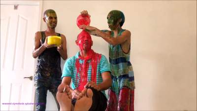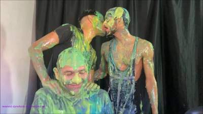 3 hot men dressed in costume as the naughty schoolboy, police man, and football (soccer) player. Of course all 3 get slimed in their roleplay costumes. Please see individual scenes for full details.