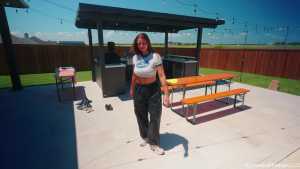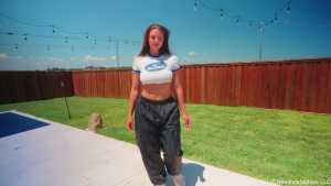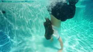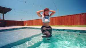 Danielle is hanging out by the pool wearing baggy Nike nylon pants, a sexy white crop top, white socks and sneakers. She first walks up and down the pool, showing off her outfit while dry. She then steps in the water, getting her sneakers and the bottom of her pants soaked. She comes back out and goes back in a little deeper until her pants are completely soaked. When she comes out her pants are clinging to her on the top and are filled with water on the bottom. After that she gets in and out again, this time also getting her shirt wet and see-through, before she gets back in completely also soaking her hair. For the next few minutes, she swims around, dives in the pool, floats on the floatie enjoying her time, until she jumps back in straight, that her shirt comes back revealing her tits. Next, she takes her shirt off and swims shirtless for a while. A little bit later, she also takes her pants off and swims naked just with her socks on. Scene contains underwater footage.