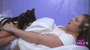 It's our wedding day. Kaya and I are totally obsessed with each other. All dolled up in our white wedding gowns, we warm each other up with a studded paddle, butt plugs and vibrating toys. We make out and eat each other out until we cum... hard. We couldn't wait to fuck after exchanging our vows. We're so eager to please, both each other and our groom. After we exchange our heartfelt vows, our groom proclaims, "you may now pie the bride!" Let the mess begin