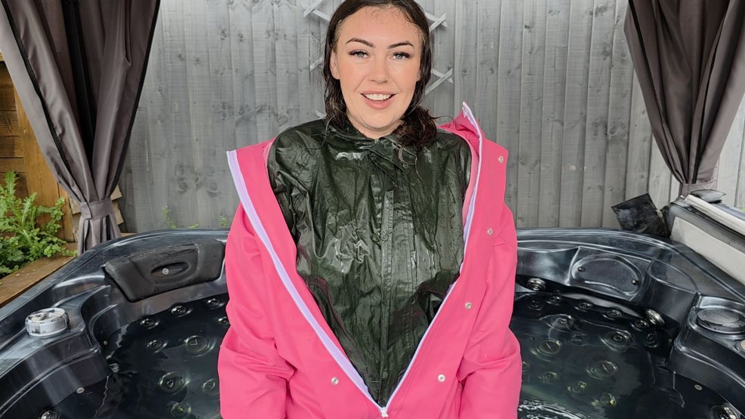 I've got myself all ready, I'm going to get in the hot tub in my lovely farmerrain rainsuit and my wellies. Starting off dipping my wellies into the water before fully getting into the hot tub. I gradually get my rainsuit enjoying splashing my wellies and floating in the water, the water making my rainsuit really cling tightly to my body. I have a fun idea that I've always wanted to try, taking my wellies off filling them up with water and pouring it over my head. Let's have a good dunk shall we and see if I can go under the water in this rainsuit. My suit soaked and filled with water it feeling so heavy. As much as I love this rainsuit shall we see what's underneath. I unbutton and unzip my rainsuit, Even more rainwear. I tease showing both my rainwear together before taking off my pink rainsuit leaving my green rainwear set on. I enjoy soaking and teasing my rainwear, the water glistening off my bum in my green rain trousers, just bouncing it up and down in the water soaking my trousers and jacket. Have so much fun filling up my hood, floating and dunking myself fully in the water follow, let's finish off by pouring water over my head from my wellies and making sure my rainwear is completely soaked. Double Rainwear in the Hot Tub is so much fun.