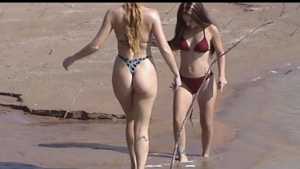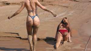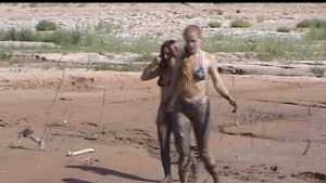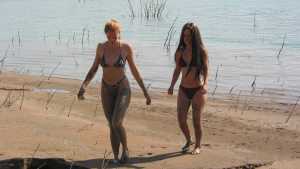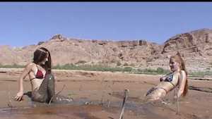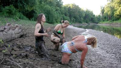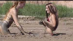 Jen and Jenna are exploring at muddy area on the shore of a large reservoir and sample several mussy areas. The find one particularly soft spot and sink there. But they want to be sure that this is the best place to play, so they wander around in their bikinis some more. But eventually they return to that deep spot and have some fun under the bright sun. They end up topless and very muddy!