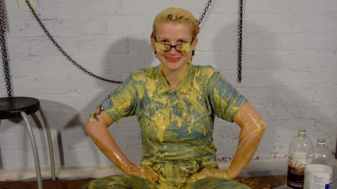 She stands up again and pours more custard into her now soaked trousers, before plonking herself down on her bottom in the massive pool of mixed mess on the floor, and pouring even more custard all over herself, totally drenching her costume in goo.