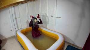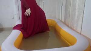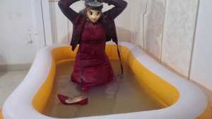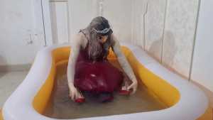 I was returning from the Christmas ball in my elegant red dress, short cardigan, sparkling heels, and my queen's crown firmly on my head. When I got home, my inflatable yellow pool awaited me, full and irresistible.