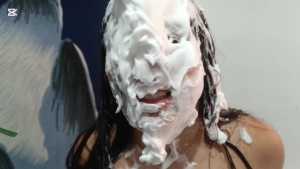 Sweet Candy is having a peaceful Halloween afternoon when suddenly a messy Ghostface with a cake in his hand appears!  What could this evil being be after?  Candy tries to run away but ends up covered in pies on her face and ass.