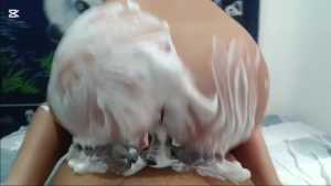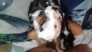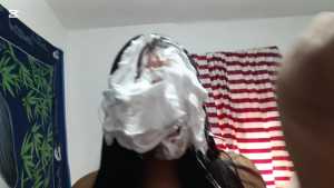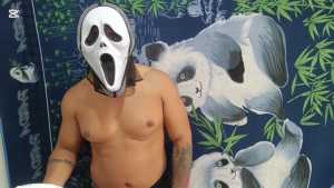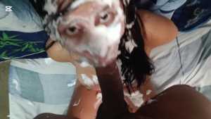 Messy Ghostface proceeds to tie her up and make an even bigger mess of her breasts, face, and ass!  It's terrifying but also sexy as he gropes Candy's breasts, then makes even more of a mess of Candy's face with more pies, and we can see her sucking Ghostface's cock with her face covered in foam, giving him a deep throat.