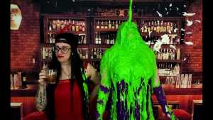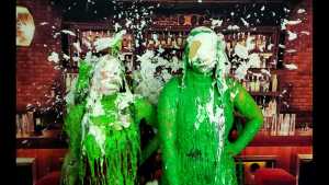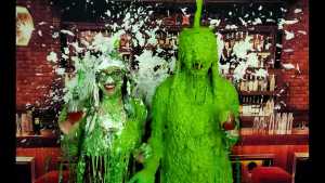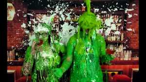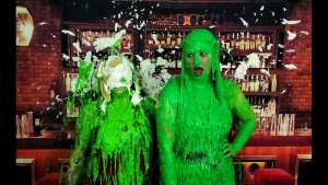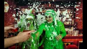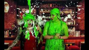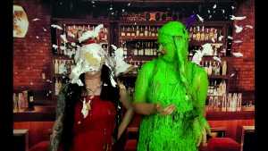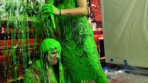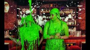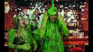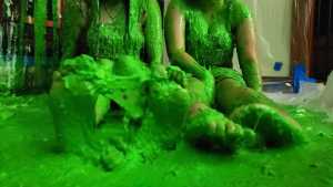 After footage has the girls playing a game to see who gets the dreaded recycled sliming. After that, they show off their messy bare feet. Finally, they play around on the pie and slime covered set.