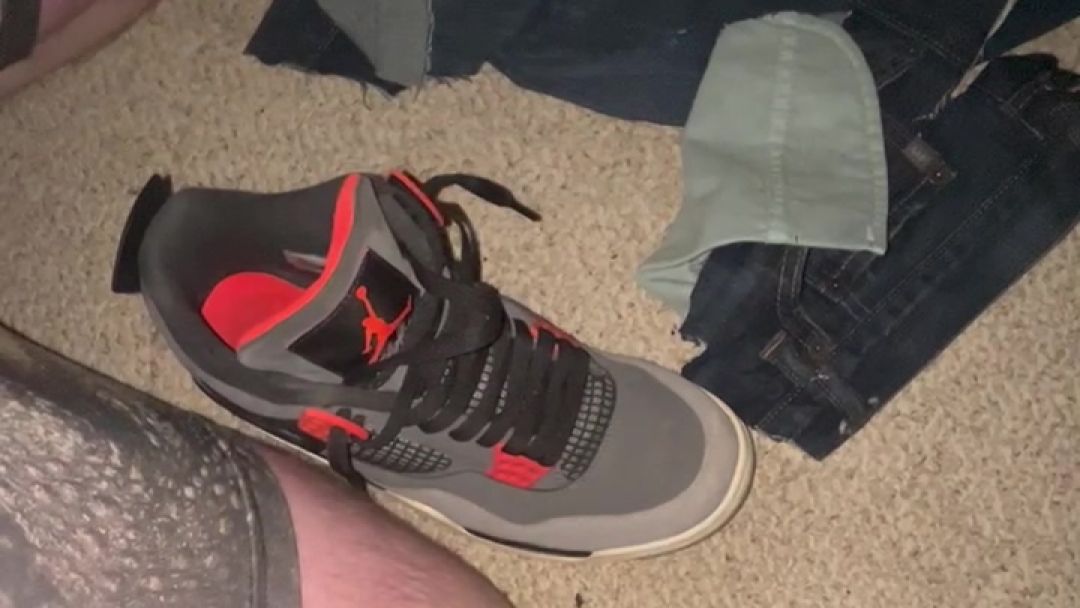 I was having some fun trashing my outfit and it carried over to my nice Jordan 4 shoes. Watch as i cut into them and make them a mess while jerking my cock and enjoying every second of it.