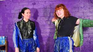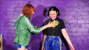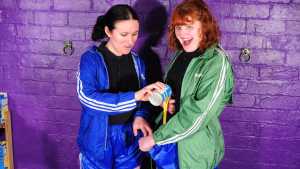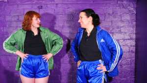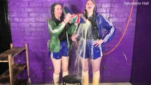 Miss Abigail and Honeysuckle are dressed up to get messed up, each wearing bright blue shiny sports shorts and dark blue polo shirts, tucked into their shorts, long white Adidas sports socks, and lightweight nylon Adidas jackets, blue for Honeysuckle and green for Miss Abigail. They both have wellies on, clear transparent ones for Miss Abigail, and union jacks for Honeysuckle, and beneath their clothes they are wearing black sporty knickers and sports bras. And they are both going to absolutely drench each other in custard!