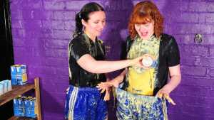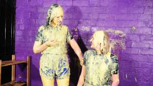 Eagle eyed readers will have noticed that so far Miss Abigail has taken all the mess on offer, and Honeysuckle is still completely clean and dry. Clearly this situation can't be allowed to continue, so Miss Abigail slips off her custard-filled boots, pours the contents of the left one into the right, and tells Honeysuckle to remove her lovely clean and dry shorts, which Miss Abigal scrunches up, and shoves down into her own custard filled boot. This messes the shorts up a bit, but not enough, so two more cans of custard are poured in on top of them, and Miss Abigail sticks her foot in too to squish the shorts properly down into the messy boot. She does this twice until every inch of the shorts are drenched in custard, then she hands them back to Honeysuckle to pull back on, over her until now clean and dry knickers and shirt. The look on Honeysuckle's face as she pulls them up tight and the cold wetness presses into her is just delicious!