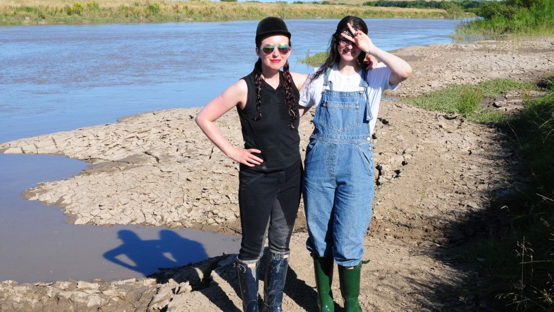 First they get wet, flooding their wellies and then lowering their bottoms into the water for a good soaking before sitting partly in the water at the river's edge. But then they start scooping out handfuls of riverbank mud from under the water, and covering each other's wet clothes in mud!