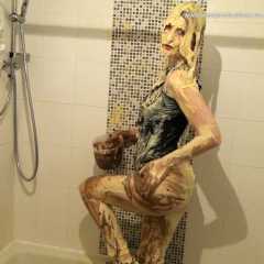 Rinsing off the tiles with the power shower, she inevitably gets wet.
