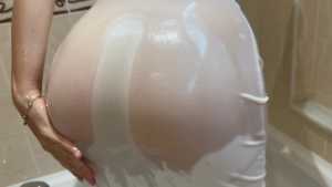 Wetlook in White Satin Sheer Dress and Pantyhose!
