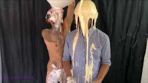 Oisin doesn't react, he just stands there, "deadpan" and waits patiently whilst Rafa covers him with the batter. Then Oisin says "I didn't mean on me... but hey, that was really fun" and he starts laughing, and they playfully throw mess over each other for about a minute. The Oisin says "I had better go and write my article" and he leaves.