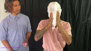 Rafa picks up a marshmallow pie and says "Okay... the very best place to start is to enjoy a pie to the face." Rafa then pies himself in the face, making sure to get really thorough coverage. Then Rafa delivers the second pie to the top of his head, to ensure his hair is thickly coated in marshmallow cream. Rafa picks up the third and forth pie and enthusiastically delivers a "pie sandwich" to himself, and smears them around with the focus on facial coverage.