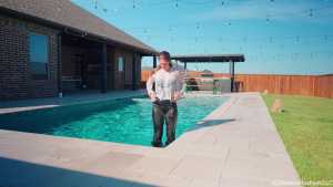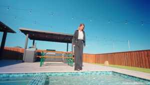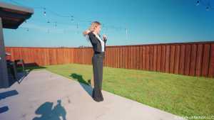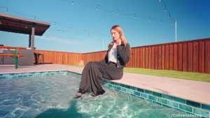 Kate is by the pool enjoying the morning sun before work. She is dressed in a sexy pant outfit with a corset, blouse and a jacket. She walks up and down the pool first to show off her outfit while dry. She then steps onto the tanning ledge, getting her heels and the bottom of her pants wet. She then sits down for a second and goes in the pool breast deep. Next she comes out again showing off her partially wet outfit before she comes back and goes in all the way, dunking underwater getting her hair wet. Now all wet, she is coming out with her outfit all shiny and clinging to her body, she steps to the edge at the deep end and takes a perfect dive in the water. For the rest of the clip she continues to swim above and underwater. She takes a few more dives and also takes her jacket off later. Due to all the dives, her blouse came out, which makes her look a little messy which is totally hot. Scene contains underwater footage.