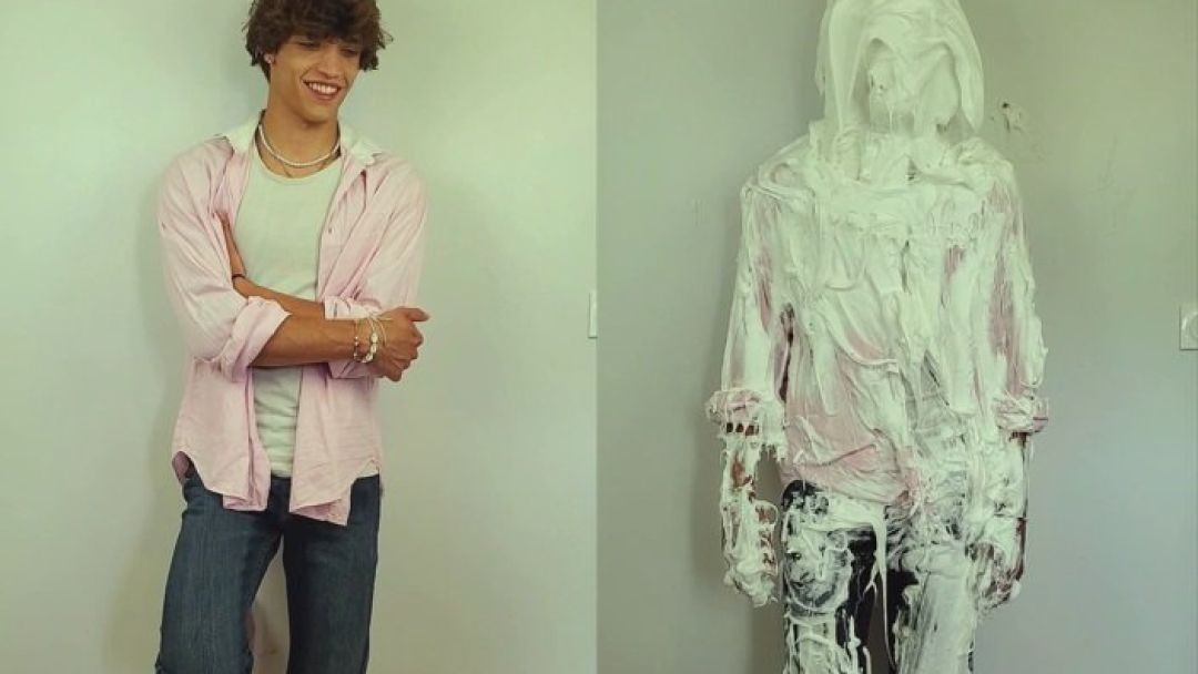 While he is wearing cool and casual clothes, this hot guy receives a first massive merringue pie in the face. The first of a long series!