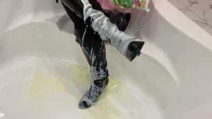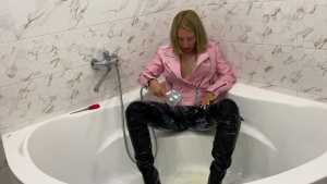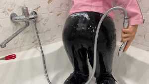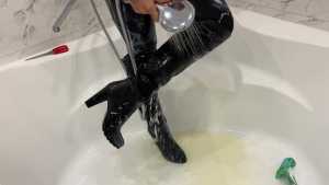 Wetlook in Leather Outfit and Sheer Top without Bra!
