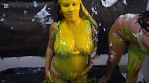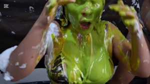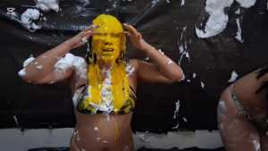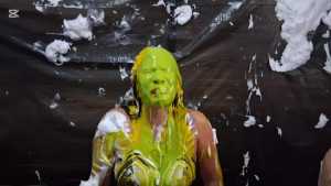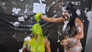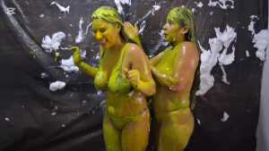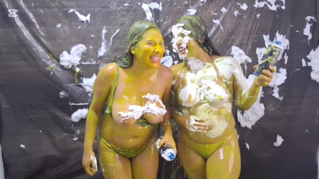 The grand finale brings the mess to a whole new level as they both get drenched in green and yellow slime, completely covered from head to toe. As if that wasn't enough, the excitement continues with a messy game of Rock, Paper, Scissors, where foam sprays directly from the can, turning the girls into a full-on slimy, foamy, and hilarious disaster. It's an epic and messy showdown you won't want to miss!