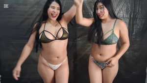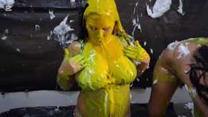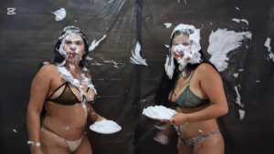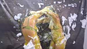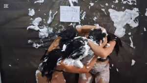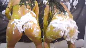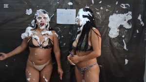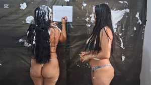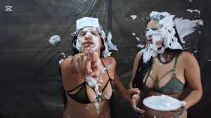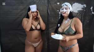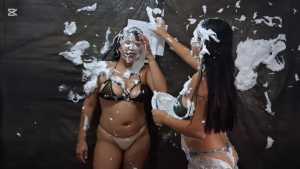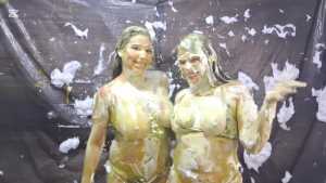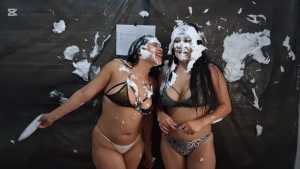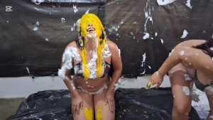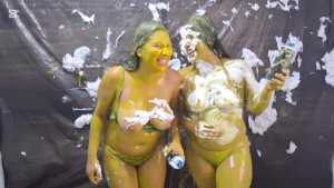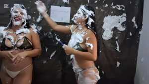 Get ready for a half hour of non-stop laughs and mess as two girls in swimsuits play a hilarious game of Charades. Every time they make a mistake, they get a creamy shaving foam pies, leading to plenty of giggles and messy moments. But the fun doesn't stop there--next up is a wild round of Hangman, where each wrong letter results in more pies to their face, tits and ass. With each misstep, the girls are covered in even more foam, creating a chaotic and hilarious scene.