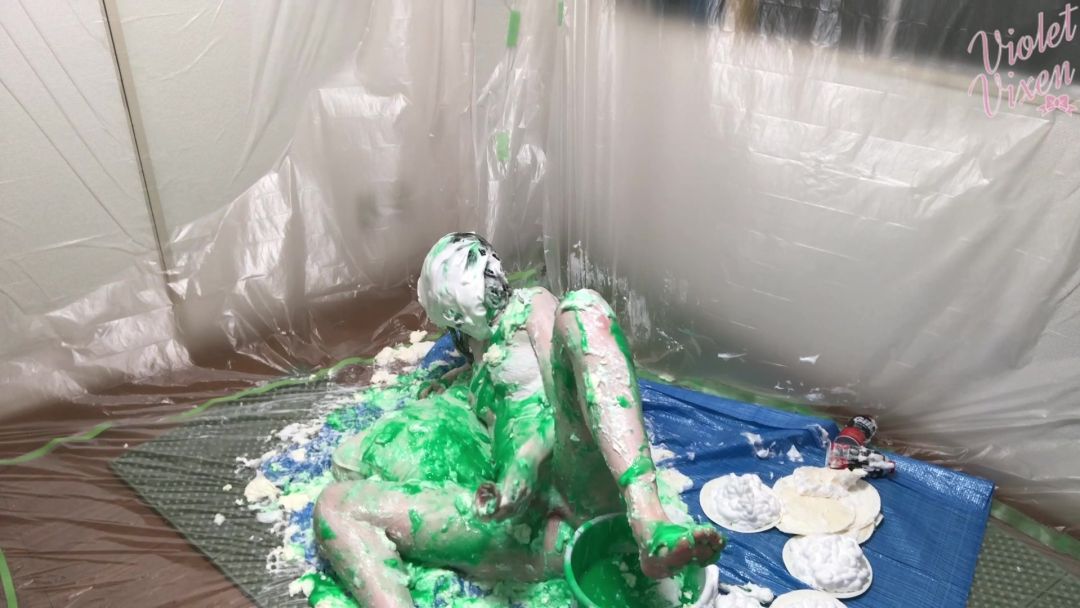 Continuation of part 1. I'm already completely covered in white substances with my long brunette hair down and super messy. I introduce some vibrant bright green slime to the gunge, cream cheese and shaving foam. I still hump the pillow, but also can't help but fuck the messy slop up my hairy pussy with my realistic dildo until I'm completely satisfied with lots of orgasms.