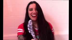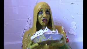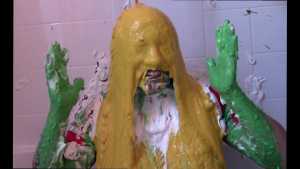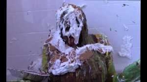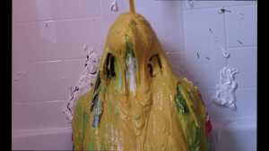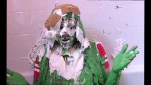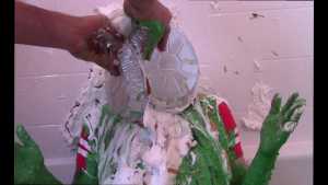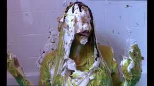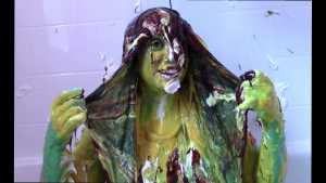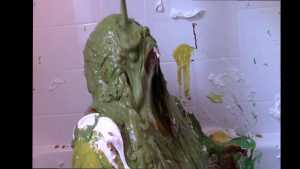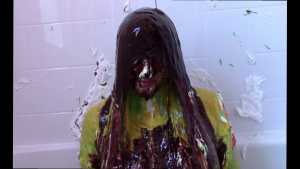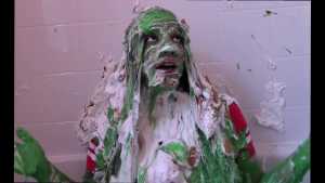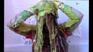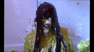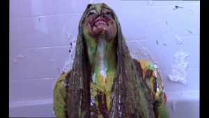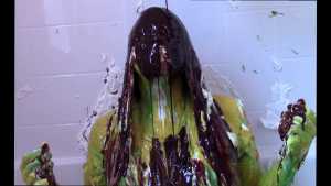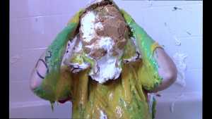 Unbeknownst to Wife, The Man has a large bottle of chocolate syrup hidden under a towel in the room. While Wife has her face covered in self pie, he unleashes his plan. He starts the long syrup pour, which was a legitimate surprise to Wife. As was the fact that this particular bottle of chocolate syrup was a bit on the cold side of things. The Man makes the bottle last a very long time, subjecting Wife to every cold drop. At one point, she comically takes the warm slime in the tub and slops it on her head repeatedly to try and block the syrup. Finally, and after one more pie to her face, The Wife becomes the target of a super sloppy recycled slime that consists of everything that had collected in the tub from the session.