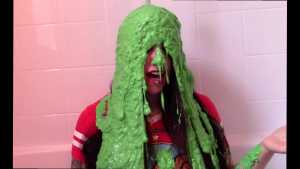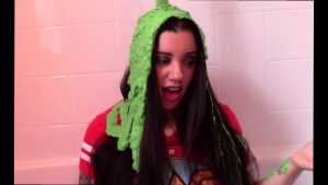 In this scene, we see The Wife wearing a red Wonder Woman t-shirt, casually brushing her hair, and immediately suspecting that slime is near. Because of this, she states that there's no way she's going to say 'I don't know'... but oops... she just did! A deluge of chunky green slime begins to rain down on her long, freshly brushed hair, with the length of the pour clocking in at just under a minute. From here she is pied, and then pie sandwiched. Following this, The Wife is dumped on with a silky smooth golden yellow sliming lasting just over a whole minute straight. She is then instructed to give herself a self pie, which she complies with. This is where things get really funny...